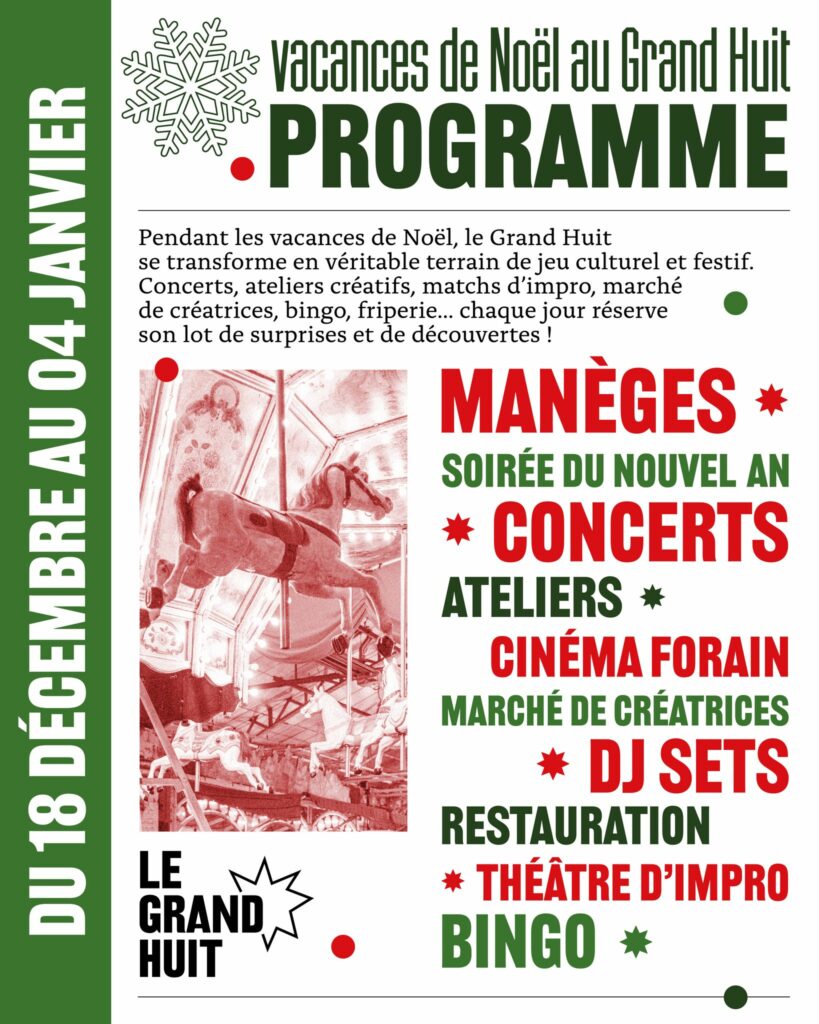 A l’occasion des vacances de Noël, le Grand Huit vous a concocté une programmation festive, du 18 décembre 2025 au 4 janvier 2026 : manèges, concerts, ateliers, cinéma forain, soirée du Nouvel An, etc… Une programmation variée, pour petits et grands, dans un lieu exceptionnel à découvrir absolument !