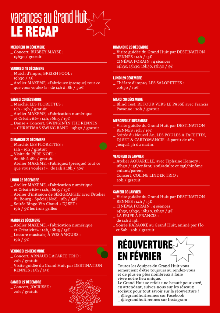 Découvrez sur le visuel ci-dessous, en bref, la programmation des vacances de Noël au Grand Huit :